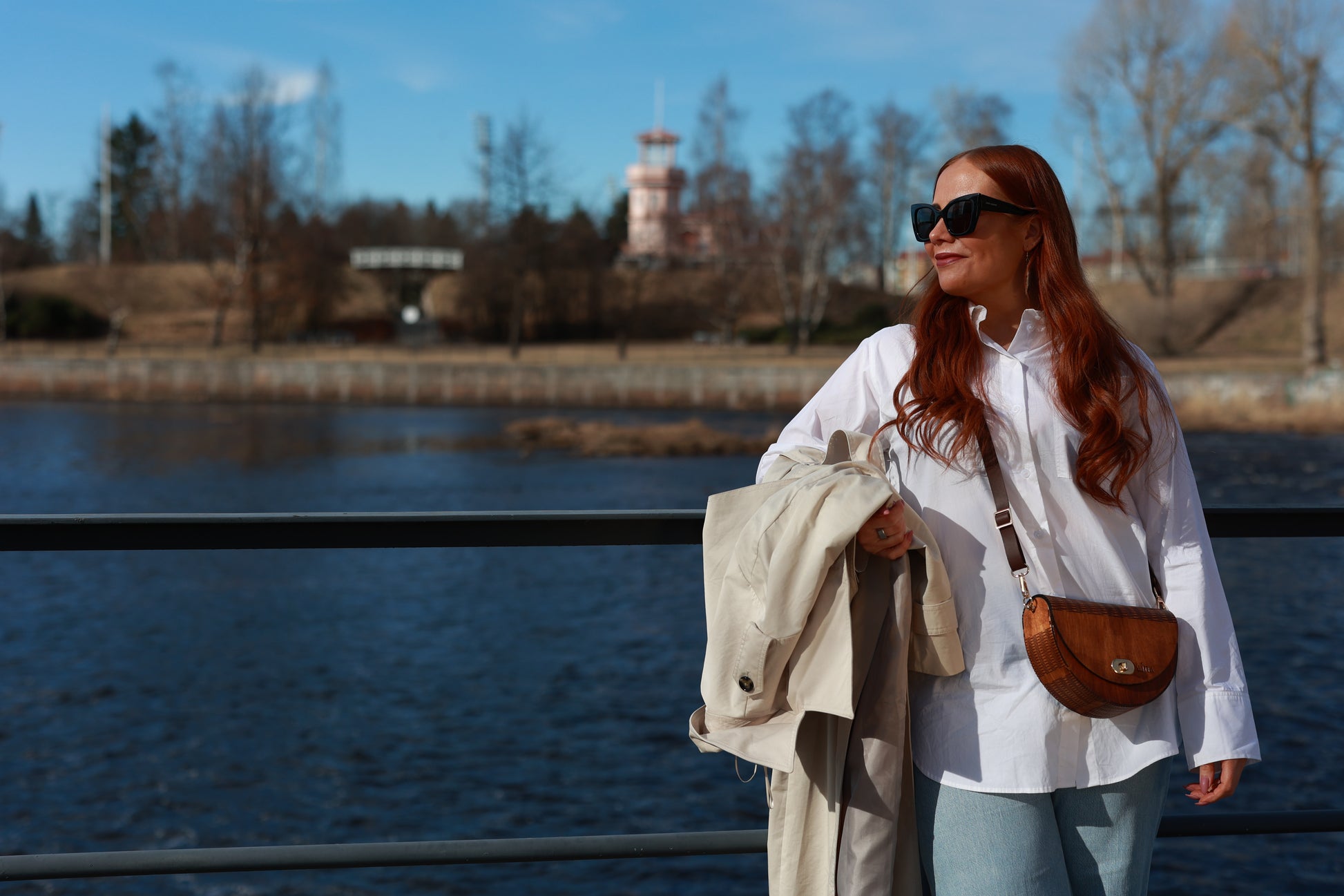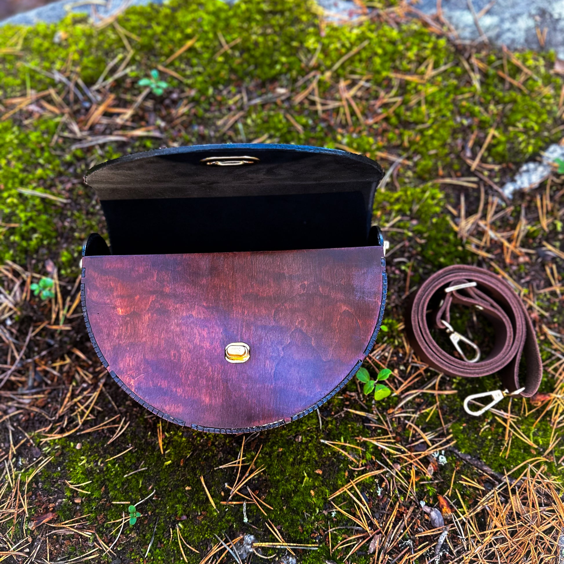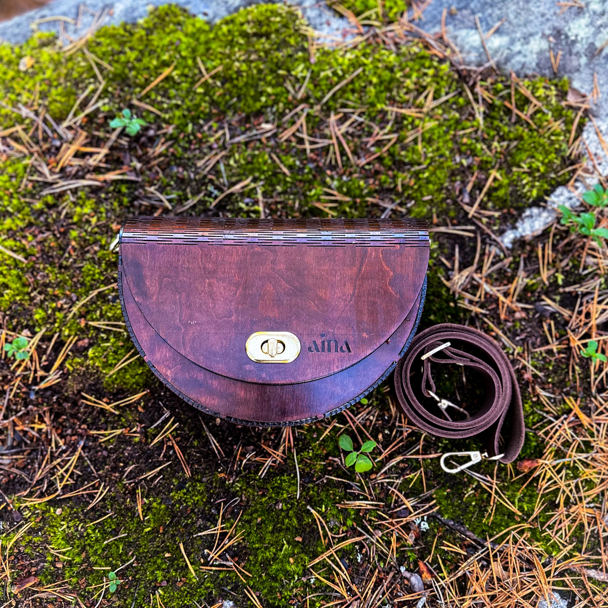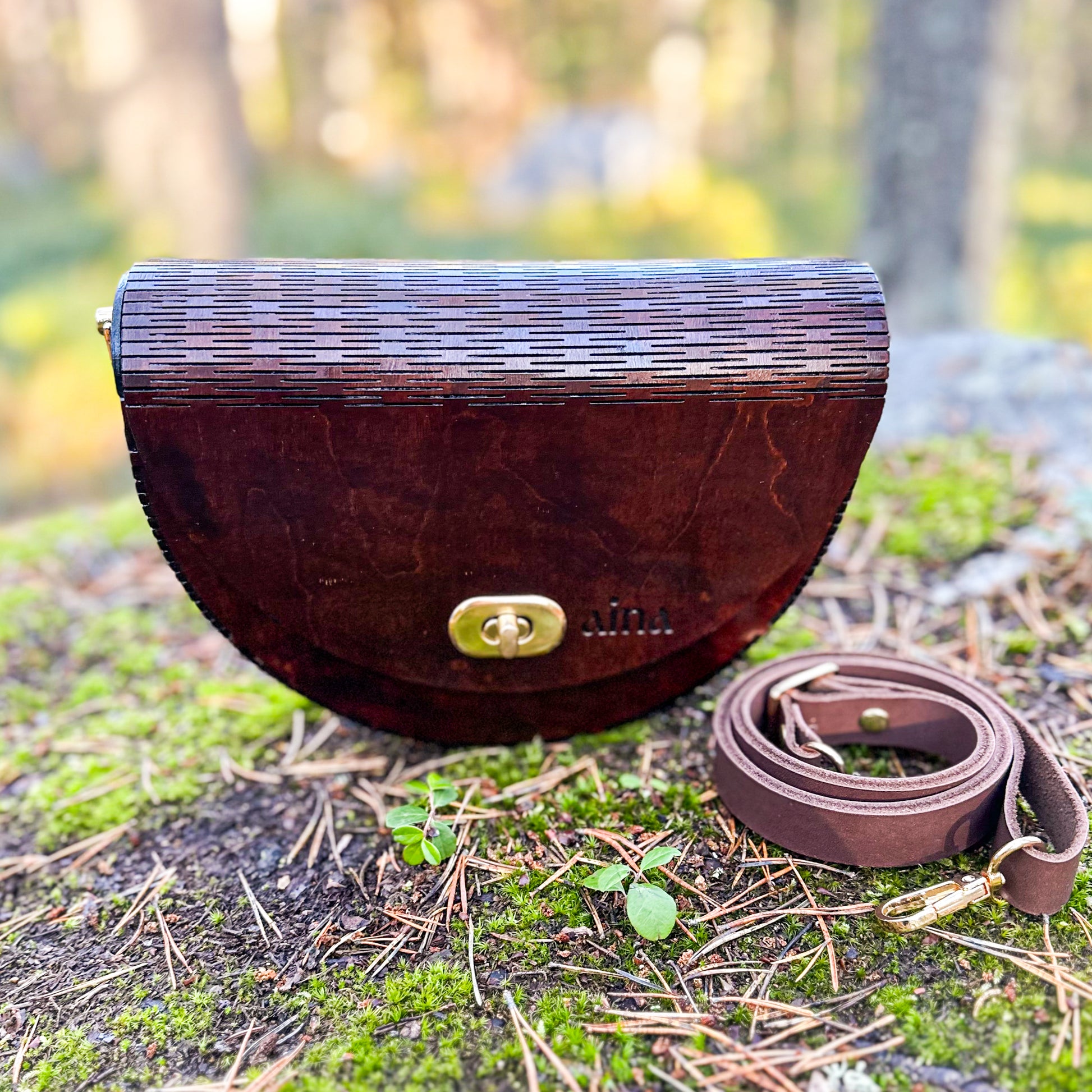 Ruskean Brownie -sävy tuo mieleen syksyisen metsän lämmön. Laukun kaareva muoto on sekä kaunis että käytännöllinen, sillä laukku pysyy pystyssä pöytätasolla. Muotokieli Halfmoon -laukuille tulee yötaivaan puolikuusta. Laukku on valmistettu suomalaisesta loimukoivusta, mikä tekee laukun pinnasta upeasti eläväisen. Sisältä laukku on mustaa poron mokkanahkaa. Tämä Design -laukku sopii mielettömän hyvin asusteeksi niin arkeen kuin juhlaan.