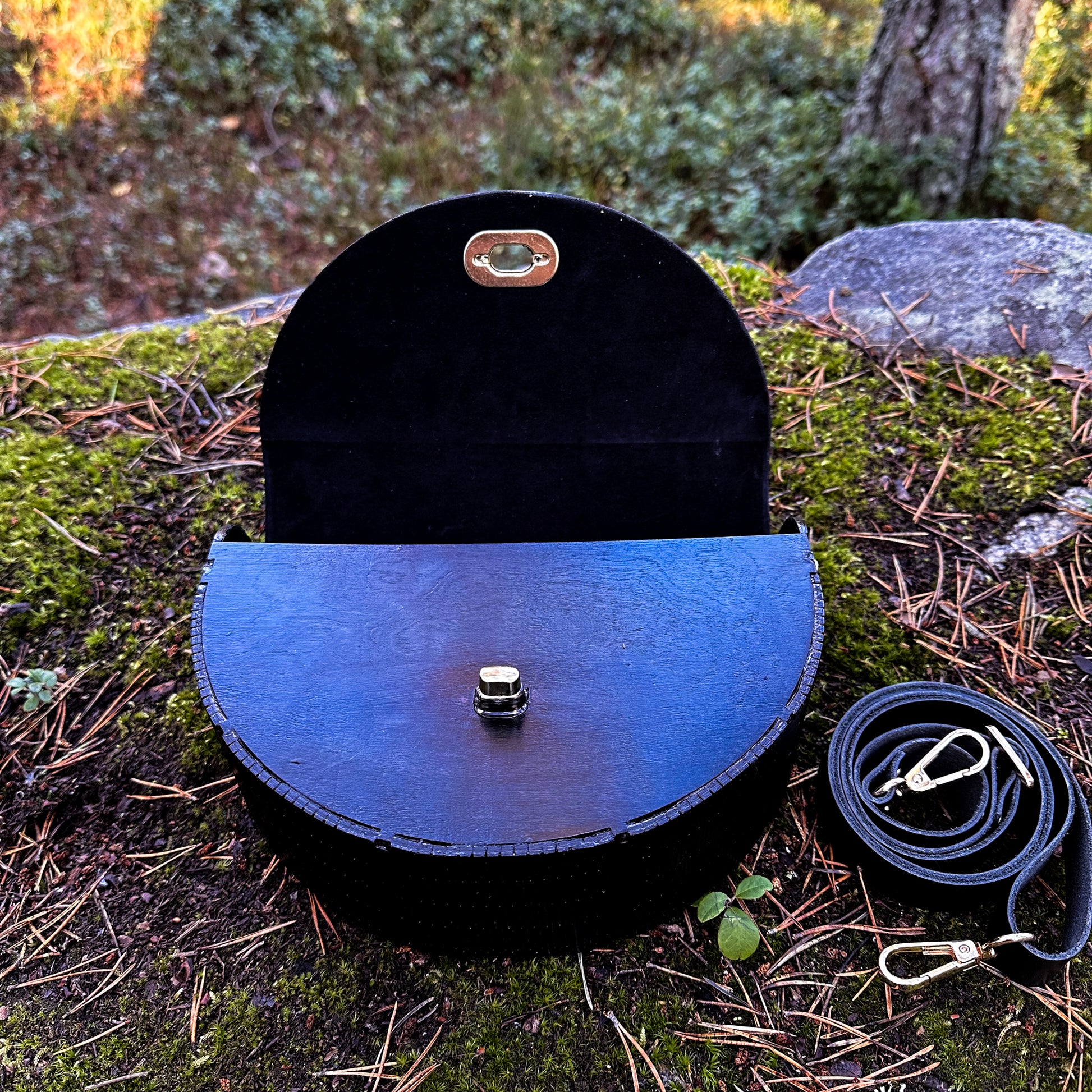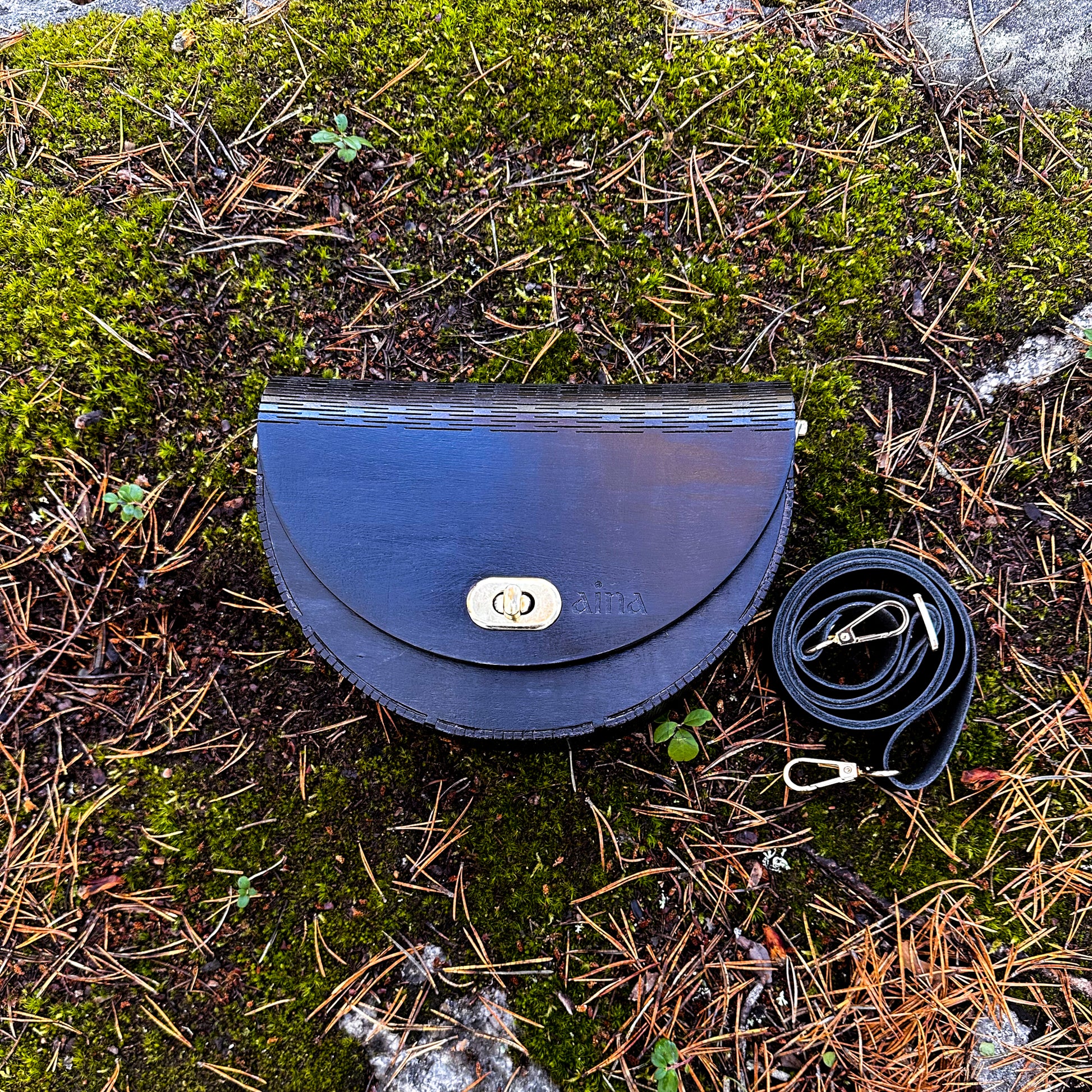 Halfmoon -laukun kaareva muoto on saanut inspiraationsa yötaivaan puolikuusta. Klassinen musta sävy korostaa eleganttia siluettia ja sopii hyvin monenlaiseen tyyliin. Muotoilunsa ansiosta laukku pysyy tukevasti pystyssä pöytätasolla. Laukku on valmistettu suomalaisesta koivusta ja sisältä se on pehmeää poron mokkanahkaa. Tämä laukku yhdistää ajattoman designin ja käytännöllisyyden.