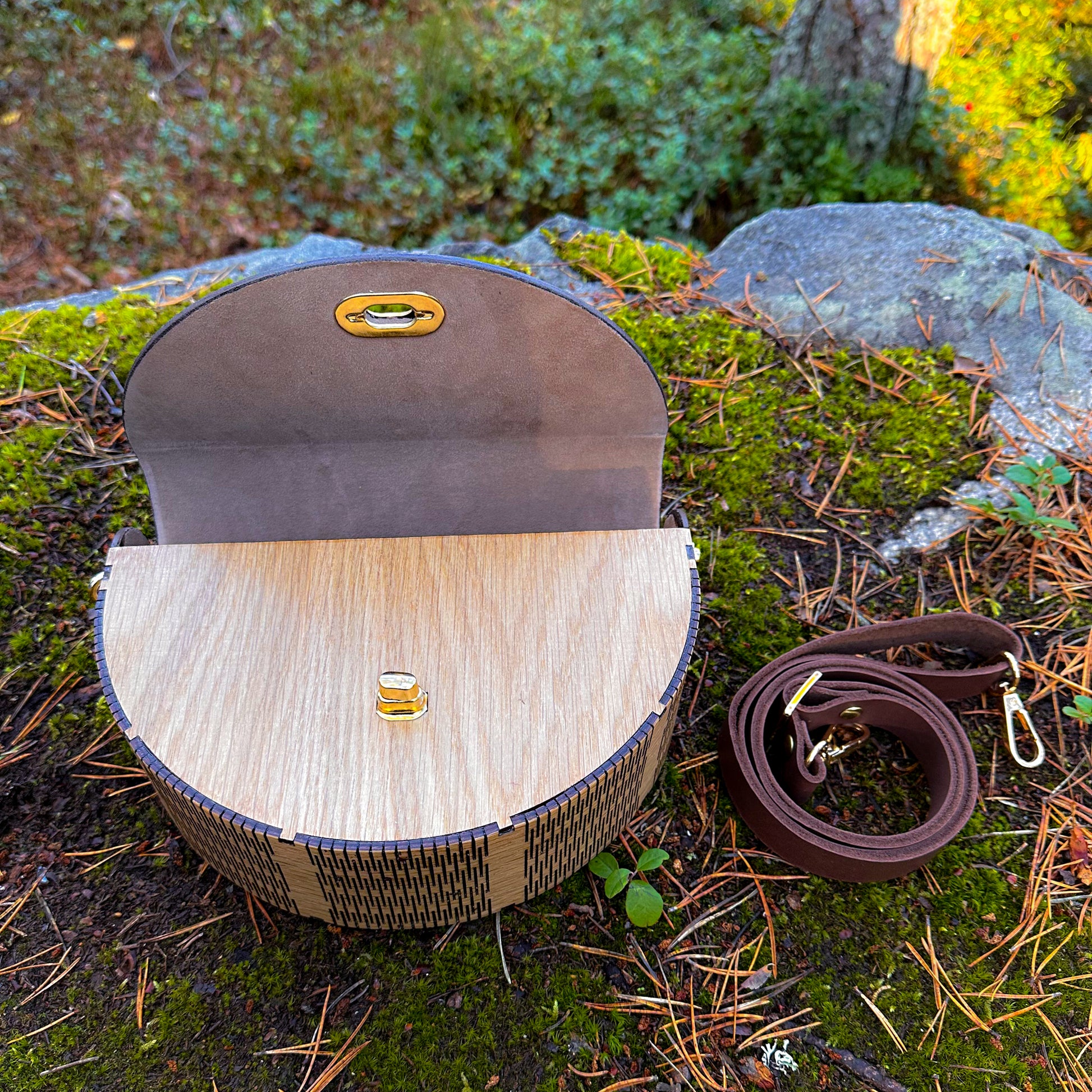 Halfmoon Oak heijastaa väriltään aamunkoiton lämpöä. Muotonsa Halfmoon -laukut ovat saaneet yötaivaan puolikuusta. Laukku on tehty koivusta, mutta sen pinnassa on tammiviilu. Tämä laukku erottuu tyyliltään edukseen upeana asusteena. Muotonsa ansiosta laukku pysyy pystyssä pöytätasolla. Sisältä laukku on vaaleaa poron mokkanahkaa.