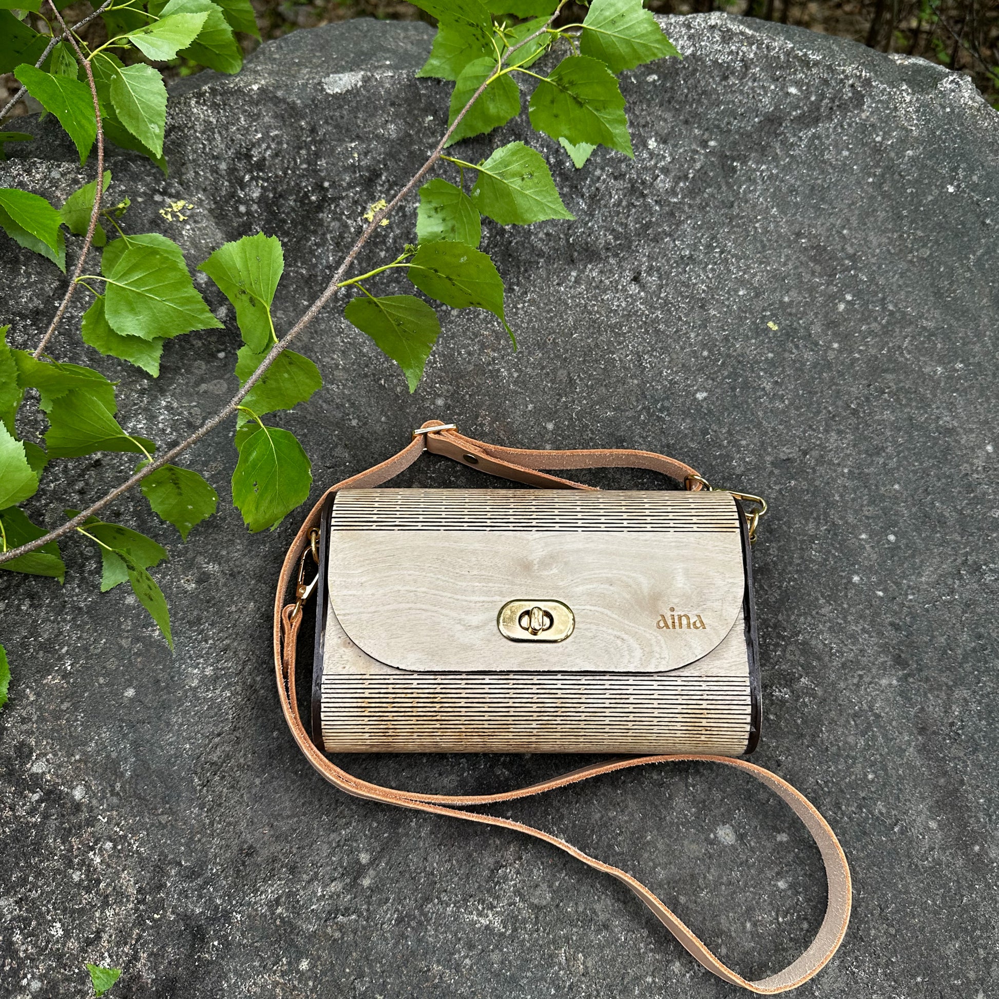 Aina Designin Sophie Birch -laukku säväyttää vaalealla, luonnollisen heleällä loimukoivun pinnallaan. Loimukoivun ainutlaatuinen kuviointi tekee jokaisesta laukusta yksilöllisen – kuin oma pieni pala suomalaista luontoa mukana arjessa ja juhlassa. Laukun sisävuori on pehmeää poron mokkanahkaa, ja säädettävä hihna tuo käyttömukavuutta. Sophie Birch on täydellinen valinta, kun etsit kevyttä, tyylikästä ja täysin uniikkia asustetta.