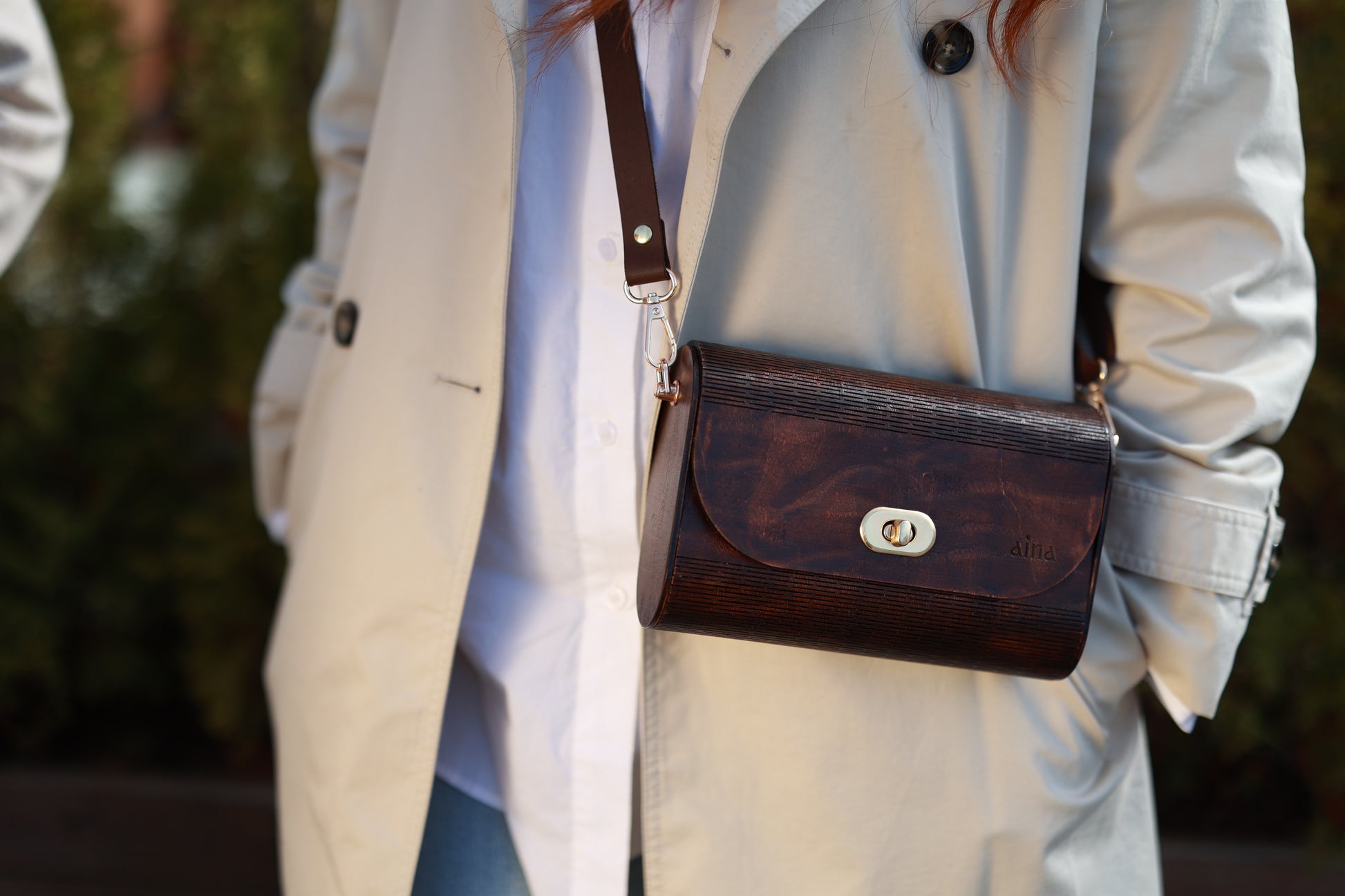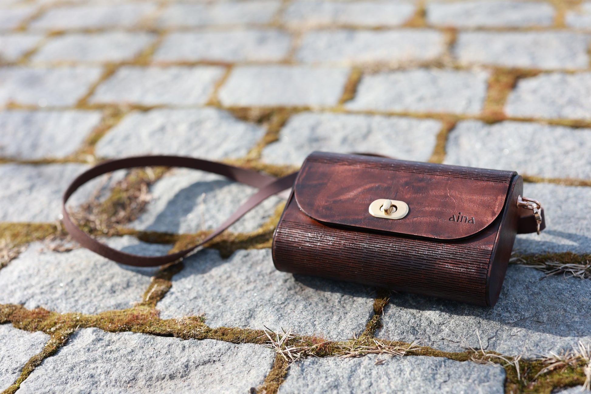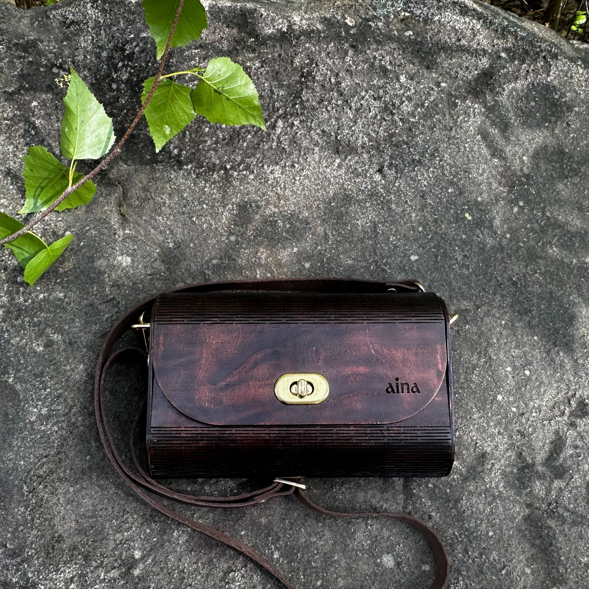 Aina Designin Sophie Brownie -laukku hurmaa upealla, syvän ruskealla loimukoivun pinnallaan. Loimukoivun eläväinen, aaltoileva kuvio tuo mieleen suomalaisen luonnon monimuotoisuuden ja revontulten lumoavat liikkeet. Jokainen laukku on uniikki – puun luonnollinen kuviointi tekee siitä yksilöllisen. Sisävuori on pehmeää poron mokkanahkaa, ja säädettävä hihna tuo monipuolisuutta käyttöön. Sophie Brownie on tyylikäs valinta, joka yhdistää luonnon kauneuden ja modernin muotoilun.